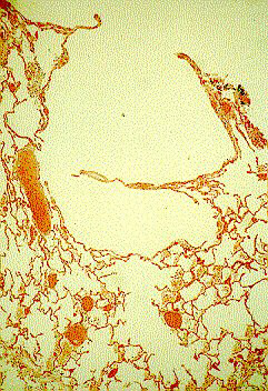 Fig.2a: Section through emphysematous lung. Note subpleural bullae and enlarged airspaces.