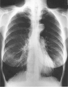 The presence emphysema can be suspected on routine chest radiography but this is not a sensitive technique for diagnosis. Large volume lungs with a narrow mediastinum and flat diaphragms are the typical appearances of emphysema Fig.8). In addition, the presence of bullae and irregular distribution of the lung vasculature may be present. In more advanced disease, the presence of pulmonary hypertension may be suspected by the prominence of hilar vasculature. The chest X-ray is not a very good indicator of the severity of disease and will not be able to identify patients with COPD without significant emphysema. However, the chest X-ray is useful to look for complications during acute exacerbations and to exclude other pathology such as lung cancer.